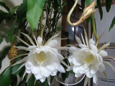 今年も7月の中旬に、一鉢目の月下美人が2日にわたり、4輪が咲きました。夜7時頃から膨らみ始め、夜中に満開になり、その名のとおり優雅な香りとエレガントな姿に大満足。