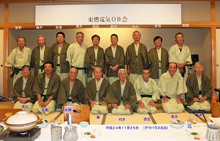 白浜(クアハウス)で温泉に入った後、全員にっこりの集合写真を撮影して、宴会開始、新入会員の狩野さんの発声で、乾杯!おいしい鍋をつつきながら、今でこそ笑い話で済ませられるが、停電させてプラントを止めてしまった失敗談、それぞれの近況や持病など話に花が咲きました。