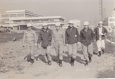 東燃の石油化学事業の参入に当り、私は昭和三十六年に和歌山工場から東燃化学の社員として勤務となり、いすず自動車川崎工場近くの借り上げ社宅に入り、そこから工場に通い良く遊び語らい仕事をしたことを思い出します。その先発隊の一枚の写真を添付しましたが、塩吹く敷地もある中、建屋・タンク・塔槽・配管・機器等次々と設置される中、塔槽類の寸法チェツクや配管図の作成等鋭意取り組み、肝心のスチームクラッキング装置のスタートアップ教育の機会を何回か失したことを思い出しました。
