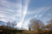 前方に空高く放射状に延びた筋雲が目を引いた。瓜久保池の方に歩いていくとジ
