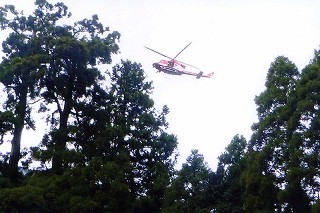 市内、竜爪山(1,150m)へ毎週登っていますが、ある日のワンショットです。 山麓を揺るがすヘリコプター2機の轟音、只事ではないと思っていたら、行き先不明となった女性登山者を捜索中でした。 写真は、消防のレスキューヘリですが、ドアーを開け捜索中の隊員2人の姿が見えます。 樹木は、穂積神社の御神木、大杉です。 以上