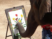 ①鼻で筆を器用につかんで、花の絵を描いてます(チェンマイ)