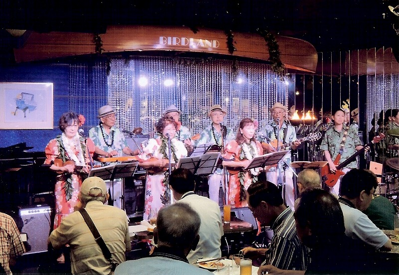 後列左より 大鐘 栄(スチール)、芳田(ウクレレ)、小町谷(ギター)、宮崎 浩(ギター)、田村(ベース=応援)