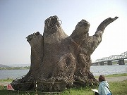昨年九月の12号台風で紀ノ川が増水、水が引いた後に、六十谷橋近くに突如として現れたのは、高さ約7m、幹の周り約12m、重さ約40トンの巨大な楠の木の大株でした。
