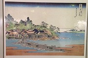 小田急線片瀬江ノ島駅から「江の島弁天橋」へ向かう途中、地下道のタイルに北斎の「富嶽三十六景・相州江の島」が描かれています(写真①)。この絵からは、現在と違って当時、島とは砂洲でつながっていたこと、また島内に三重の塔が建っていたことが分ります。