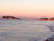 写真⑥は、七里ヶ浜から望んだ、朝日に染まる「江の島と富士山」の光景です。手前のゴマ粒のようなのはサーファーで、寒いのにご苦労様、という他はありません。