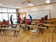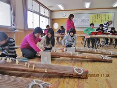 6年生92名全員の体験学習でした。筝では「さくらさくら」の曲を一人ひとりがうまく弾け るようになりました。これは、織音グループの女性メンバーによるお筝の提供及び指導による ものでした。