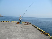 民宿「水久」の女将さんの迎えを受け、車で宿へ直行、5人で3部屋を確保できたので安眠のできる部屋割り後、別送荷物を整理し幕の内弁当の昼食を摂った。しばらく休養した後、全員で式根港桟橋に行き釣りを開始した。この日は真夏日でギラギラと照り付ける太陽にもめげず、全く当たりの無い中17:00の納竿まで、ひたすら竿を出したが全員坊主。