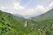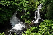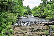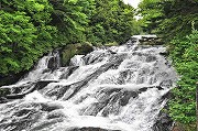 まず。戦場ケ原に沿って車道を10分ほど戻り、赤沼からはハイキングコースに入る。特に、湯滝からから流れ中禅寺湖に注ぐ湯川に沿って竜頭滝上まで歩く40分ほどの林間コースは、あまり人に会うこともなく、川のせせらぎと野鳥のさえずりの中で奥日光の静かな自然が楽しめるお気に入りコースだ。この日はやはり芽吹きの頃の色とは違いやや濃くはなってはいたが、日差しの中で輝く緑はまだまだきれいで心が洗われるようだ。 竜頭ノ滝上 (写真-2) も静かですばらしく美しいところ。ここから300mほど滝に沿って下ると (写真-3)、滝つぼになる。この滝つぼ (写真-4) の紅葉も有名で色づき始めるのが早く、TVのニュースで紹介される。