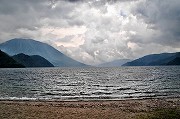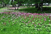 途中で昼食をかねてゆっくり休んだこともあって、千手ヶ浜に着いたのは1時近く。中禅寺湖の西岸に広がり、華厳の滝から遠く離れたここ千手ヶ浜は、とても静かでまるでスイスの湖を思わせる美しいところだが、この日はどんよりした曇り空になってしまった (写真-5、左の大きな山が男体山)。クリンソウの群生地 (写真-6) はここからすぐ近く。まさしく見頃とあって、ここだけは無公害バスや観光船で訪れた観光客やハイカーでいっぱいだった。クリンソウはきれいだったが、早々に、ここを離れて、さらに次の目的地の西の湖(サイノコ)に向かう。ところがその途中で雨が降りだした。あっというまに強い雨になったので西ノ湖まで歩くのをあきらめて、今日のハイキングをここで終えることにした。予報より早い雨が残念ではあったが、それでも3時間半ほどの楽しいハイキングができた。最後は無公害バスで駐車場まで戻る。