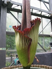今回の日本一は、熱帯植物温室で見ることができました。スマトラ島原産のさといも科の「ショクダイオオコンニャク」というのがそれです。花のサイズは、高さ2m72cm、直径108cm。