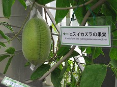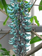 デッカイといえば、同じ熱帯植物温室に学名ジェイドバイン(和名ヒスイカズラ)の実を見つけました。マメ科の植物でこの4月のはじめころ花をみたのですが、藤の花のような花房(長さおよそ1m)に勾玉のような形のまさにヒスイ色の花をたくさん付けていました。(写真は5年前のもの)そのうちのひとつが結実したのでしょう。マメ科だけに長さ20cm、太さ10cm位のずんぐりとしたデッカイ鞘でピンポン玉位の実が二つ入っているようでした。枝豆のようにして食べたらおいしいだろうと想像するだけで楽しくなりますね。