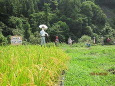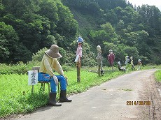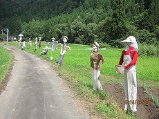 長野県の白馬から長野市に向け山岳のワインディングロードである国道406号線をドライブ。鬼無里(きなさ)の農道にて「かかしコンテスト」を見かけた。 大賞作品はまるで本物の農夫が座っているようだ。傑作ぞろいの案山子に、実った稲をついばみに来たすずめたちも、さぞかし驚いたことだろう