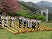 平成27年4月19日(日)秦野丹沢まつり「丹沢山開き」が神奈川県立秦野戸川公園内で行われました。 朝8時半からの式典のあと、スイスの民族衣装に包まれた男女約30名によるアルプホルンの演奏を聴くことができました。