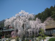 、仏殿と並び左手には五重の塔とその大伽藍に圧倒されます。そしてありました、今まさに満開、樹齢400年といわれるしだれ桜、寺院を背景に枝一杯に、可憐な花が降り注ぐように咲く姿は圧巻の一言です。