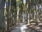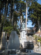 しばし佇みその姿を堪能、奥の院に向かいます。本堂裏手より身延山ロープウエイ、山頂、奥の院までは7分の空中散歩、高低差763米を一気に上ります。高地順化の耳の違和感を感ずる間もなく標高1153米の身延山山頂、「奥の院」に着きます。ここには日蓮が両親に思いを馳せた霊場「奥の院思親閣」があり、参道の階段両脇には樹齢700年と言われる日蓮聖人お手植えの老杉が霊樹として聳えています。
