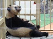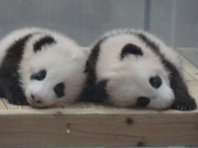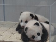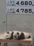 授乳時間になると、飼育スッタフに抱かれて、交互に隣室の母親「良浜」(ラウヒン)の所へ、受乳後抱えられて飼育室から出てきた赤ちゃんパンダは、1頭ずつ体重測定、記録され再び展示ボックスの中へ、仲良く並んでお昼寝の時間です。満員の来園者からは、“元気に大きく育って”などの声が聞かれました。