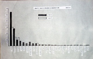 今回はその中の2004年と2014年の10年間の合計個体数を棒グラフに表して見ました。この間には畑だったところに住宅が建ったり幼稚園が出来たり林の木が切られ道路が出来たりコースの周囲が大分変わりました。