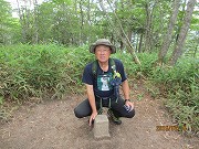 登山道から10mほど入った林の中にぽつんと「三角点」の標石。ここが山頂ですが、雑木に囲まれ展望はまったくありません。 |
