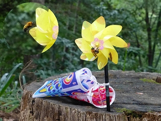 高尾山奥の登山道脇で、蜜を求めて「ミニ鯉のぼり」の風車に止まろうとする蜜蜂発見! 蜜蜂が風車の上縁に止まると羽根がクルット回転し下へ、何度もトライしやっと辿り着いた風車中央の花芯に蜜は? 以上