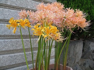 彼岸花と云えば、通常赤か白色ですが、近所の玄関先で珍しくピンク、オレンジ及びイ エロー3種の、彼岸花(学名: Lycoris radiata、通称:リコリス)の鉢植えを見かけ、写真を撮らせてもらったので紹介します。 生花店の話によると、10年程前にこの種の種芋を置いていたが今は無く、極めて少なく珍しいとの事です。 以上