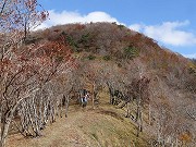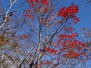 ここからは尾根伝いに広大なモミ、ツガ等の樹林の山道を経て、コース最大のガレ場をやり過ごし、伯母子岳下の「深タワ」に着きました。コース全体に今年の紅葉は平年より1週間~10日早く、登山道のブナ、ミズナラ等の黄葉や朴葉は落葉し、辛うじて山楓や山紅葉等の紅色系が若干残っている程度で期待外れでした。最後に雑木とカヤトの多く急峻で細い登山道を喘ぎながら登り、正午前に「伯母子岳」頂上に到着しました。