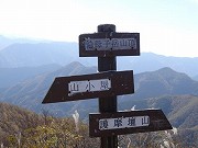 奥高野随一の展望を誇る頂上からは360°遮るものが無い大展望で、西から北に奥高野の山々、東に波打つ大峰山脈の釈迦が岳、南に果無山脈の山々が紫雲に霞み、見渡す限り山また山ばかりです。昼食をとり名残が尽きない山頂を辞し、西稜の急な斜面を下り、再び「深タワ」で遊歩林道に合流、往路を折り返して登山口に着きました。山は真冬並みに寒かったが、爽やかな秋空の下、快適な登山が終わり19時頃無事和歌山駅に帰着しました。