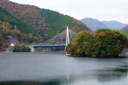 ダムの方に行くと斜面の紅葉が美しい。湖面にぽつん、ぽつんとカイツブリやオオバンが小さく見える。双眼鏡で確認する。道路に近いところではマガモの群れがV字を横にした形の白波を引いて勢いよく滑っていく。遠くにカワウの群れが横に並んでとまっているのが見える。右手には白い永歳橋がくっきりと見えていた。