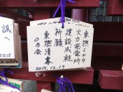 “厄(89)を払う”という89段の石段を登り本殿へ、厳粛な気持ちで賽銭を投げ、拝礼。「清水LNG火発」の建設計画成就を絵馬に託して奉納、みんな笑顔。