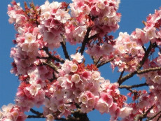 和歌山市中之島、国道24号線沿いの桜並木の1本が、例年より早く立春前に開花、2月中旬には満開となり周辺住民や通行人達を楽しませてくれました。「地蔵の辻」交差点を西へ約100m、バス停横の早咲き桜の桃色の花が青空に映え、春の訪れを感じます。