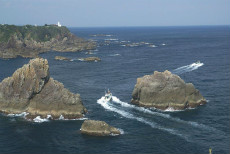 写真-1 海金剛(海面から切り立つ巨岩群)と樫野埼灯台。