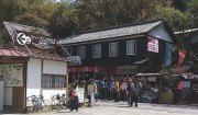 吉野山駐車場手前の急な長い坂道にかかると、ずっと立ち漕ぎだ、一旦止まったら押して行 くしかない。やっと歩行者天国前へ着いた。ここからはバイクをついて下千本まで花見散策。地 元警察の鼓笛隊や大勢の行楽客とすれ違う。