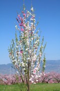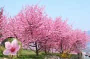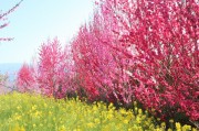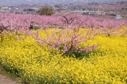 甲府盆地では、桜が満開になった少し後に桜より濃いピンク色の「桃の花」が満開になります。また低地から徐々に標高の高い山麓方面に向かって開花していくため、比較的長く花を楽しむ事が出来ます。今回訪れた時期は少し遅めで、山麓に近い場所が満開状態でした。山麓から眺める甲府盆地は、ピンク色の絨毯が広がり大変綺麗でした。果樹園は濃いピンク色に咲く桃の木(食用)が殆どですが、白・ピンク・赤や混ざりなどの花桃(観賞用)も所々に咲いており、こちらも綺麗でした。無料解放された果樹園では、桃の花・花桃・菜の花・水仙・チューリップなどが満開で、観光客の「綺麗だねー」の歓声や残雪の南アルプスと桃の花を入れ記念写真を撮る光景があちこちで見られました。
