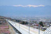 「リニアの見える丘花鳥山展望台」からは、タイミング良く南アルプスをバックに桃の花が咲く中を試験走行する「超電導リニアモーターカー(2027年開業予定)」を眺めることが出来ました。