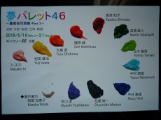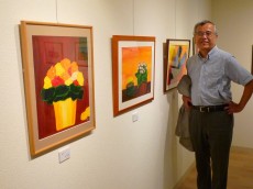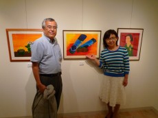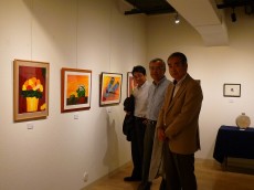 銀座6丁目の一角にあった瀟洒な会場には慶応大学46年卒の美術クラブの皆さんが水彩画や陶器、工芸品、版画と様々な作品を展示されてました。中村さんは水性アルキド樹脂(アクリル樹脂と油の両方の性質を持っている樹脂)絵具の「アキーラ」を使った作品を4点出展されてました。