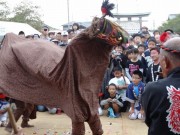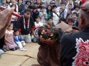師子舞は地上の舞と、地上5m(だんじりの上)の舞があり、特に後者は獅子に扮した2名が5mもの高所に設置された2本の青竹の上で激しく舞い踊る梯子獅子で、家内安全などを願うものと云われますが、スリリングで目を離す事が出来ません。
