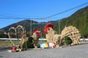 “酉”は地元の有志が10日間かけて作った「ニワトリの夫婦」と「2羽のひよこ」。間伐材や竹で作った骨組みにニワトリは軽トラ3台の稲ワラを、ひよこは生の杉の葉を、厚く丁寧に張り合わせた傑作で、鮮やかに赤く塗られた雄鶏のトサカが初冬の青空に映えて見事であった。雄の“酉”は高さ3.6メートル、幅6メートルと巨大で迫力ある作品だ。ジャンボ干支の作成は当地の年末恒例で県内外から多くの見物客が訪れ、歴代ジャンボ干支を掲載したカレンダーの販売や、夜間のライトアップ等があり来年2月末まで展示される。