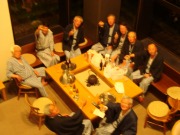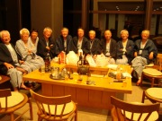 1日目、プレー終了、入浴後の食前酒をへて、地元の湯葉刺身や山菜天ぷらなどを肴に千駒の冷酒で懇親。おいしい(高い)酒で、数本の4合瓶があったいう間に空いてゆき、幹事は翌日の勘定精算が気になって生酔いになってしまいました。1次会の冷酒が効いたのかロッジでの2次会(写真①、②)も適度に21時には切り上げ散会となりました。