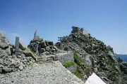 室堂 - 祓堂 - 一の越までの登山道は残雪があり歩行に気を付け立山連峰の景色を見ながら進む。一の越からは急斜面の岩場となり落石に注意し、雄山山頂へ、参拝後、お札を頂き下山。(行程時間:4時間半) 昼食後、弥陀ヶ原湿原の散策。