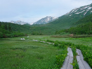 入口付近は高層湿原です。左から白馬三山の鑓ケ岳、杓子岳、白馬岳(正面)が見えます。 |