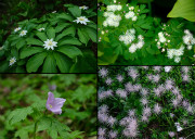 左上より時計回り、キヌガサソウ、カラマツソウ、チングルマ、シラネアオイ。 |