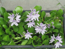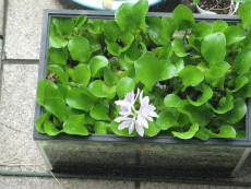 2015年5月に旧総研跡地のホームセンターで買った布袋葵=ホテイ草が、庭の水槽で今年も綺麗に咲きました。一輪咲いた後、徐々に花の数が増えました。