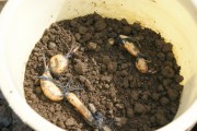 3月初旬に、昨年の容器の土(泥水)の中から蓮根を探して、30L漬物樽に田土を入れ、蓮根2切れを植え付けた樽を40樽作りました。田土は軽トラックで1杯分が必要でした。
