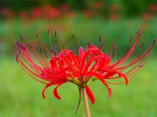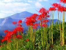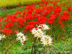 寺坂棚田の彼岸花は、9月中旬から下旬が見頃とのこと。先日通過した大型台風(18号)の影響が心配されましたが、棚田の土手や通路脇に植えられた彼岸花は、黄金色に色づいた稲穂と競うように真っ赤な花を咲かせていました。