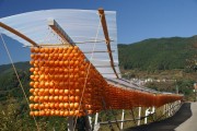 かつらぎ町串柿の里四郷(しごう)の串柿作りです。 たくさんの柿が専用干し場や農家の軒に暖簾のように吊るされ、柿色一色になります。