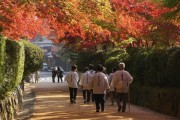 高野町の蛇腹道(じゃばらみち)です。 早朝の道はきれいに掃き清められています。 伽藍入り口から東塔東側付近までのびる300mくらいの小道。 周囲の紅葉と寺はとても美しい。