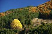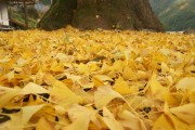 木の下は黄色い絨毯のようです。 近くの国道311号からの遠景も際立った存在感があります。