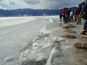 信州諏訪湖が全面結氷し、覆っていた氷が寒暖差により膨張と収縮を繰り返し、隆起する自然現象を「御神渡り(おみわたり)」という。 近年の温暖化により、現れるのは5年振りである。 せり上がった氷の道筋が、諏訪大社の上社(男神)と下社(女神)を結ぶ筋だといわれている。 以上