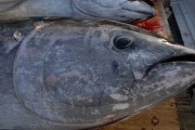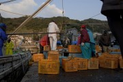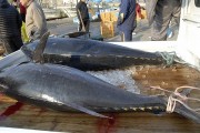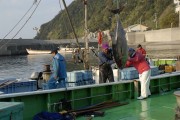 体長1.8メートル重さ100kg超えのクロマグロが、4本掛かりました。 このクロマグロを見るために見物人が駆けつけて賑わっていました。 クロマグロはあまりにも大きく重いため、網から外すのに手間取り、陸揚げして車に乗せるまでベテラン魚師さんも悪戦苦闘していました。