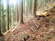 写真―4:切った杉やヒノキは、枝を払い約4m長にしておきます